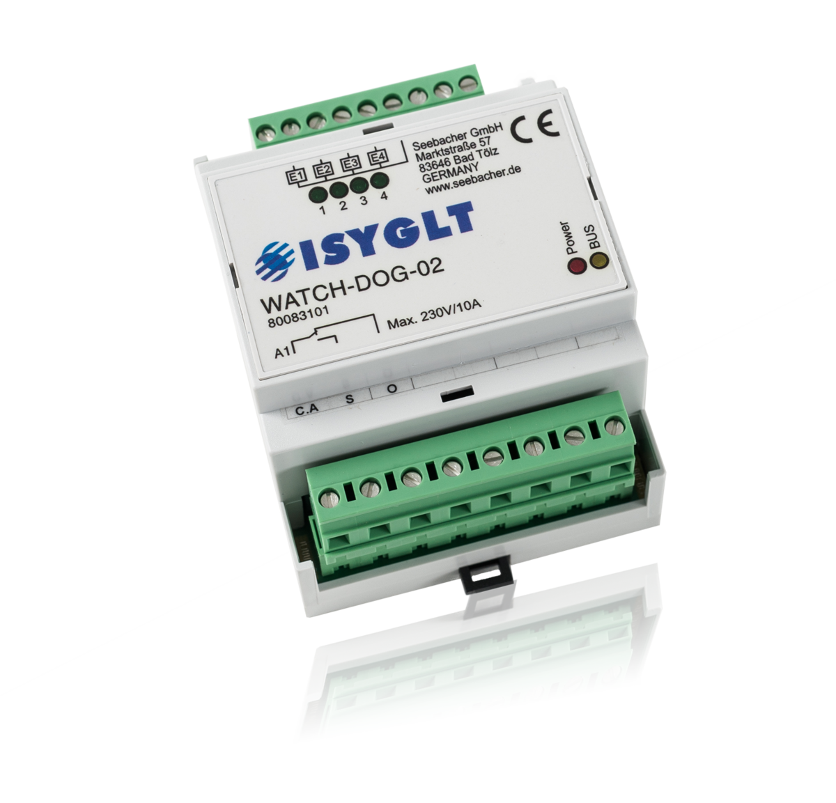 The WATCH-DOG Module is used to monitor the ISYGLT subnet. An application case is switching to an emergency operating level when errors are detected in the BUS or the Power Supply. Short-circuits and interruptions of the BUS line or a failed Master Module can be detected with the module. This module can be used to switch redundant BUS segments to a second Master Module, for example, or to control corresponding emergency operation relays in sub-distribution boxes in the event of failure/emergency. The time until the output is activated when an error is detected can be adjusted via parameter setting. A test function is also available in BUS operation.