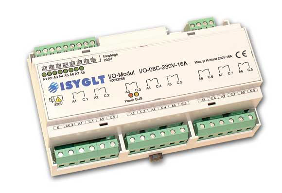 Mit dem I/O-Modul I/O-08C-230V-16A können 8 Stromkreise mit maximal 230V/16A geschaltet werden. Die Phasenlage der einzelnen Sicherungen ist beliebig. Als Eingänge stehen 8 Optokopplereingänge 230V auf einem gemeinsamen Gegenpotential zur Verfügung. Alle Ein- und Ausgänge sind über die Software in den Funktionen frei programmierbar.