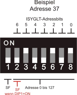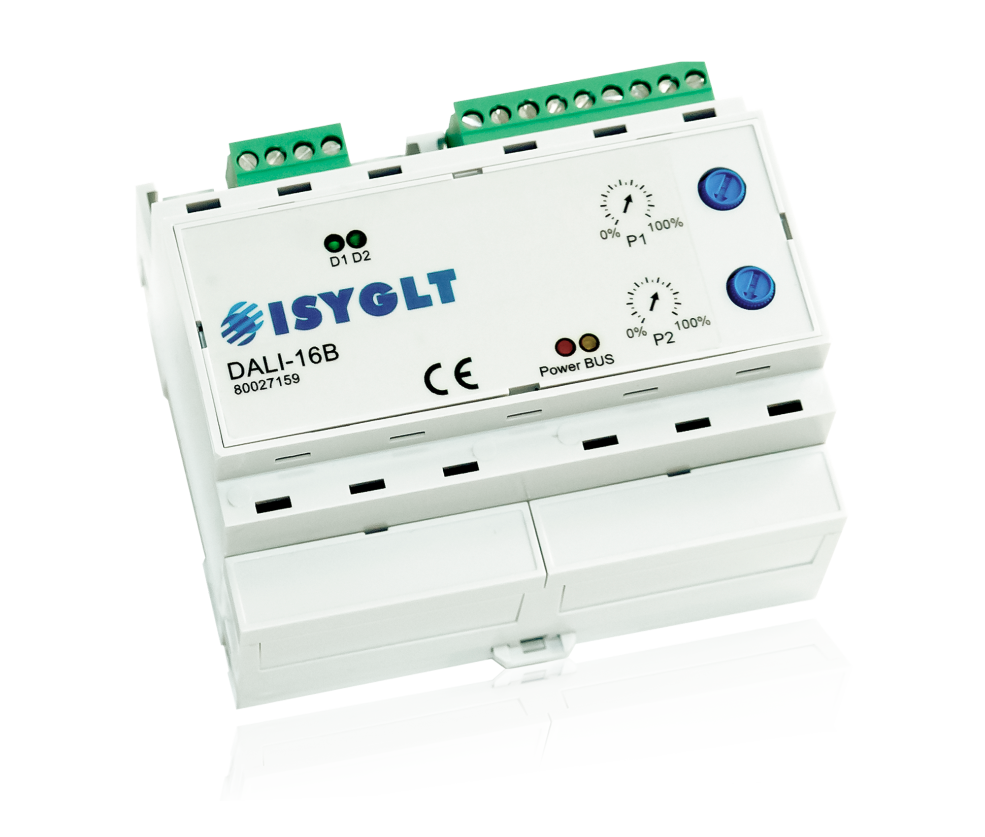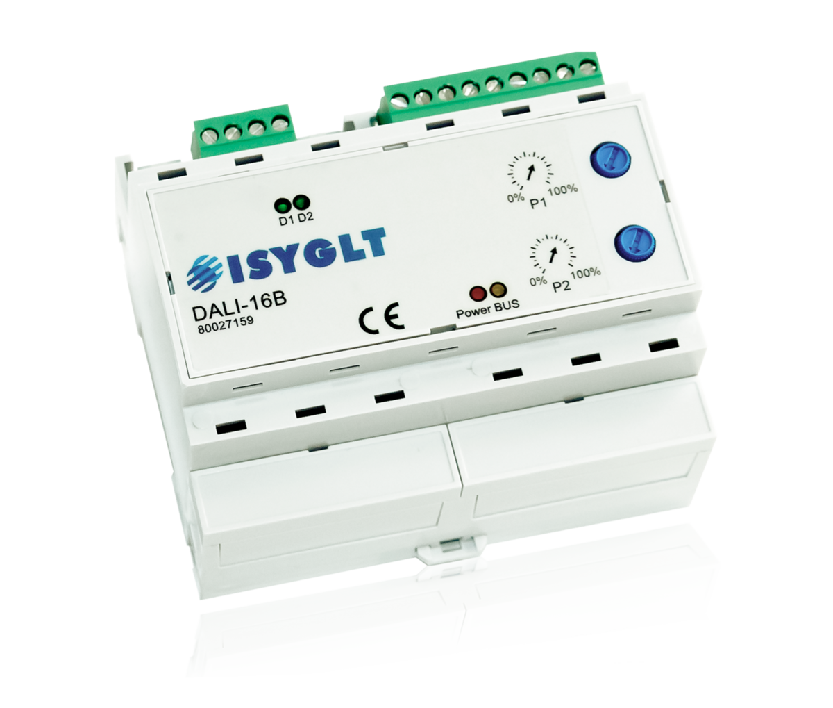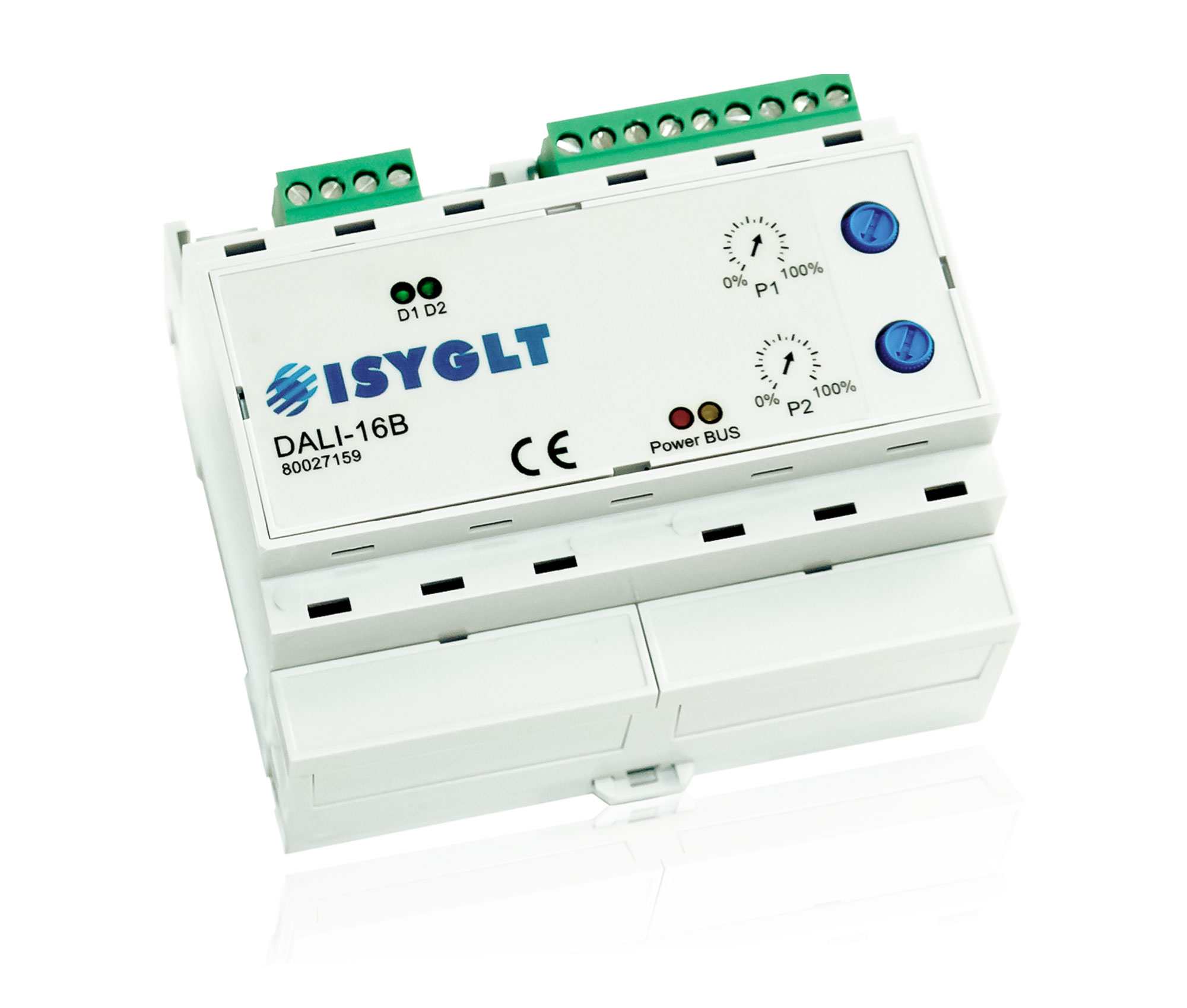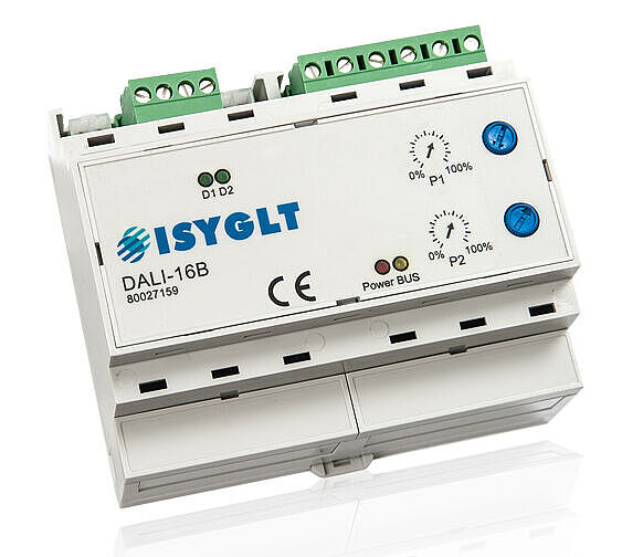 DALI Module for controlling up to 64 DALI lamps. Each of these 64 DALI devices is programmed with a unique device address. One of 16 ISYGLT dimming groups can be assigned to this device address by parameterising the DALI-16B Module.