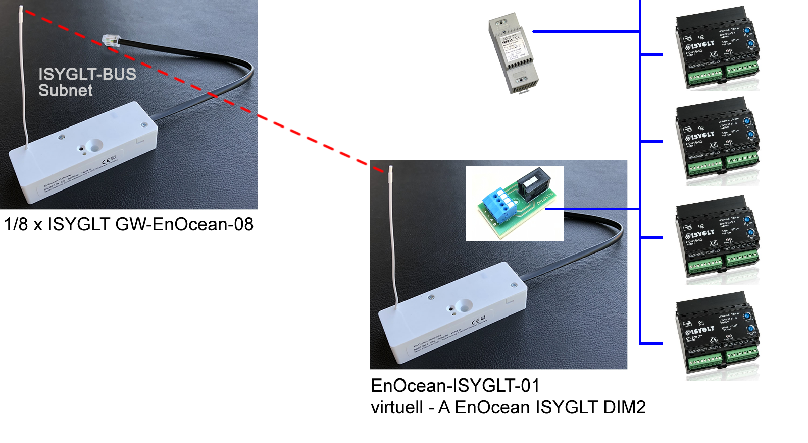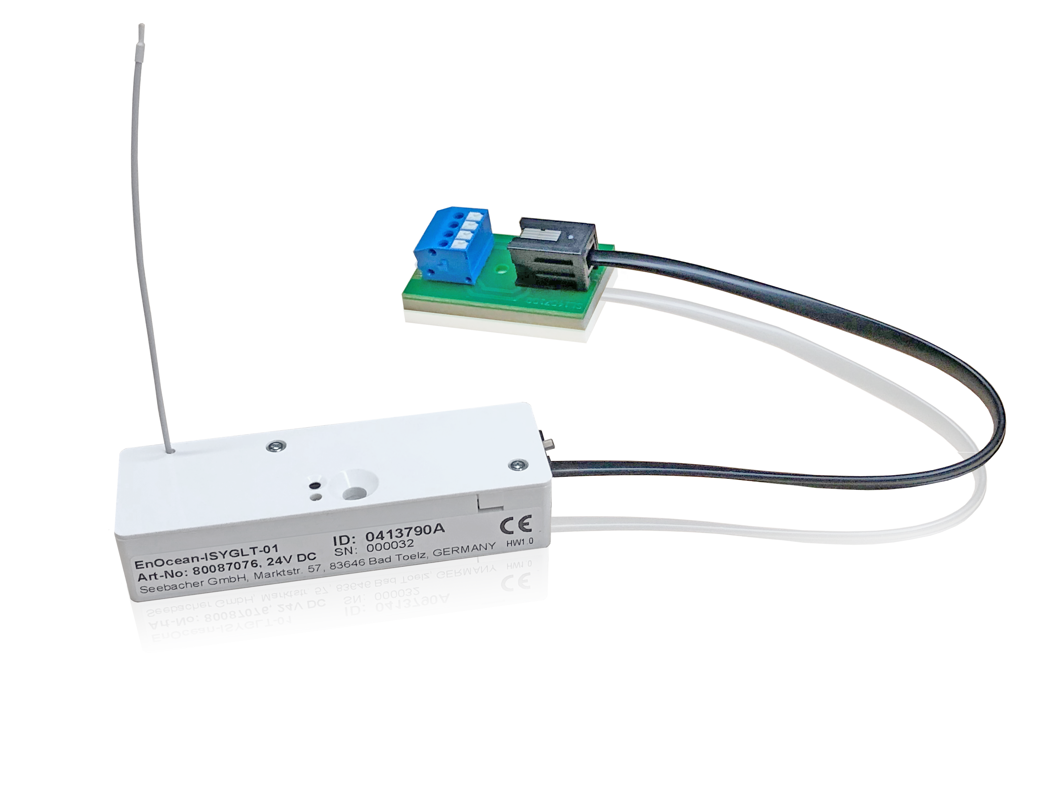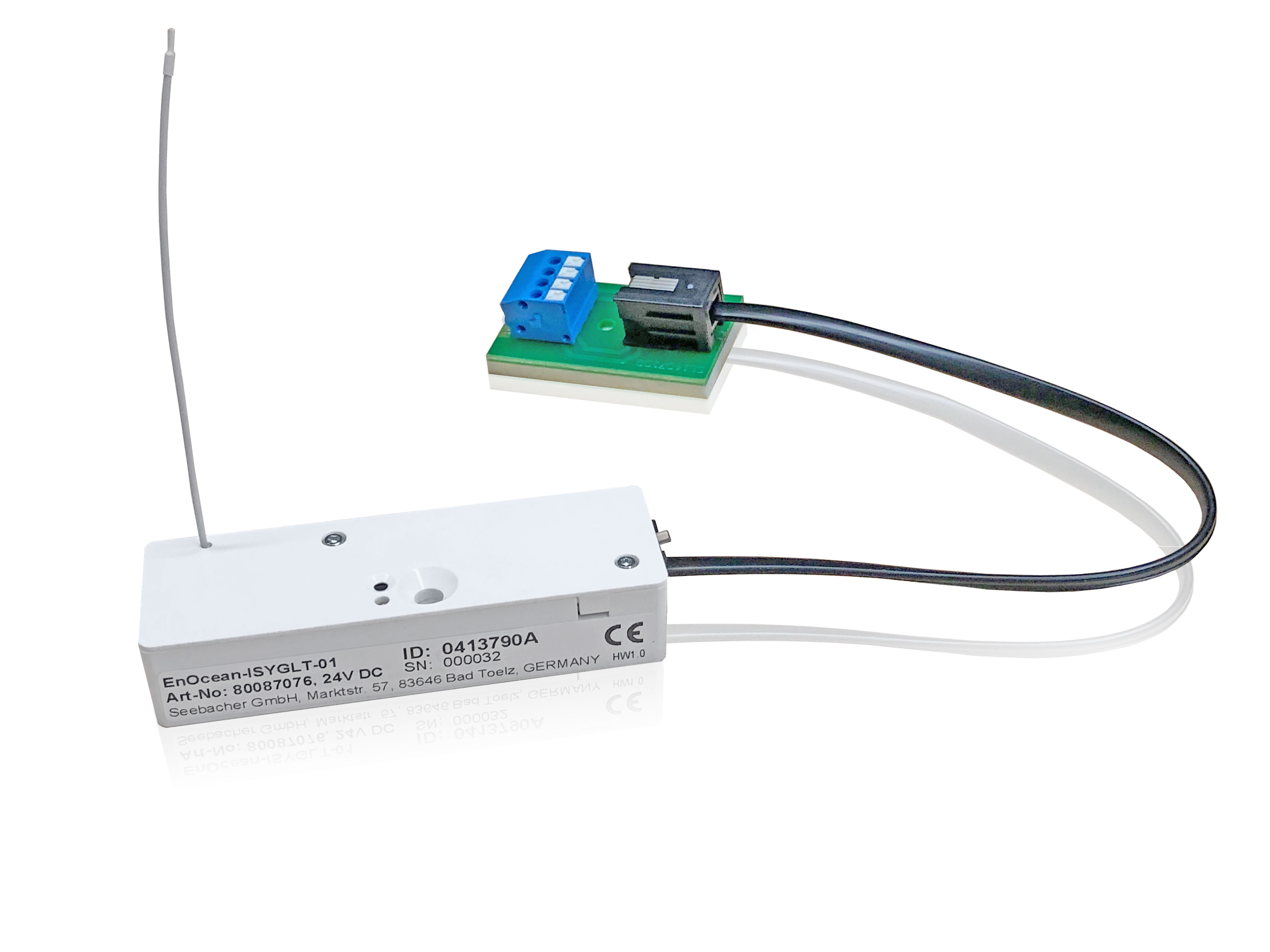 The EnOcean-ISYGLT-01 Sensor/Actuator Module is used for wireless radio connection of defined ISYGLT modules to EnOcean technology. The module receives the information from the ISYGLT GW-EnOcean-08 Gateway and converts it into a mini ISYGLT BUS system with a maximum of 4 addresses.