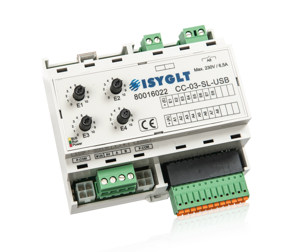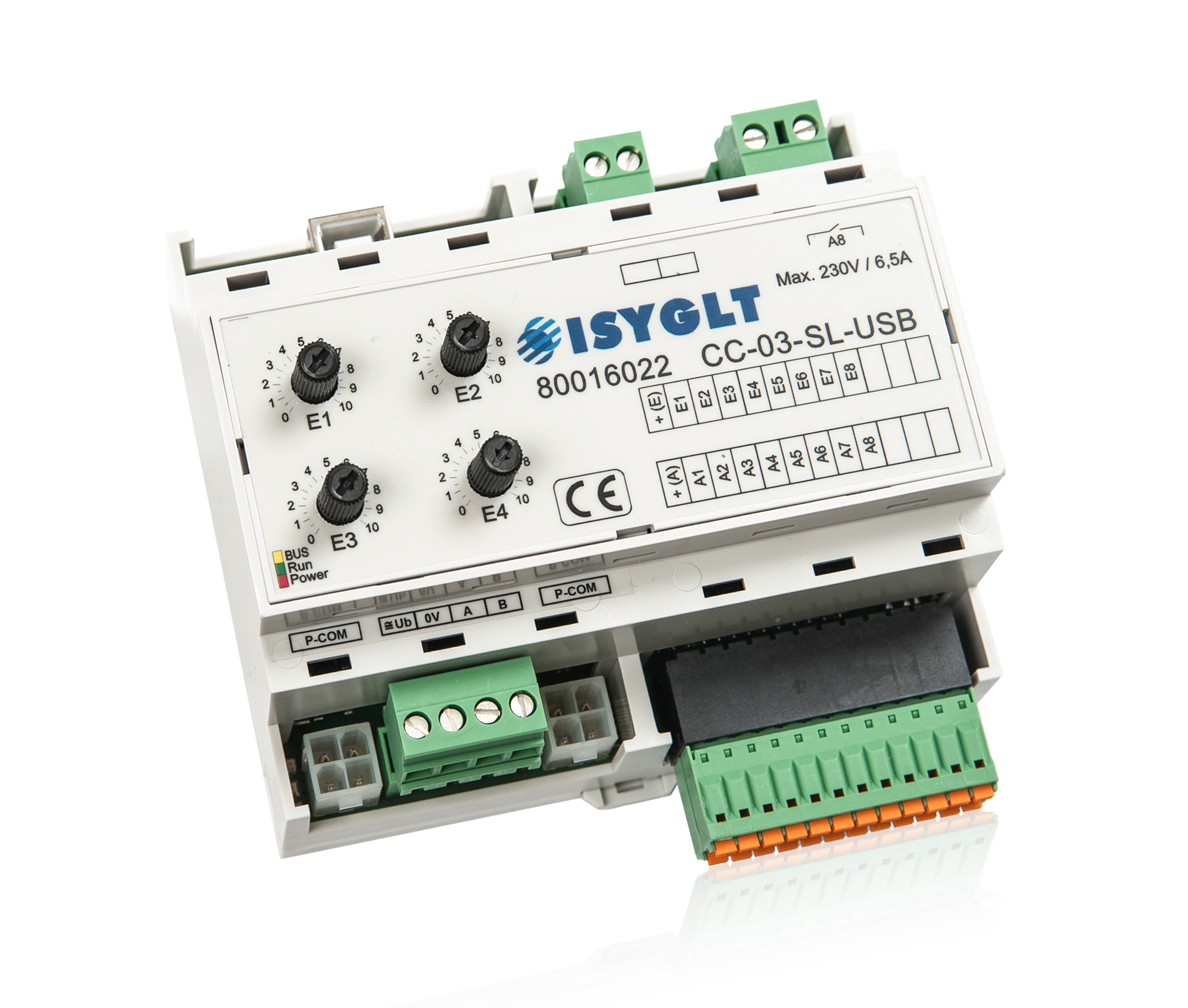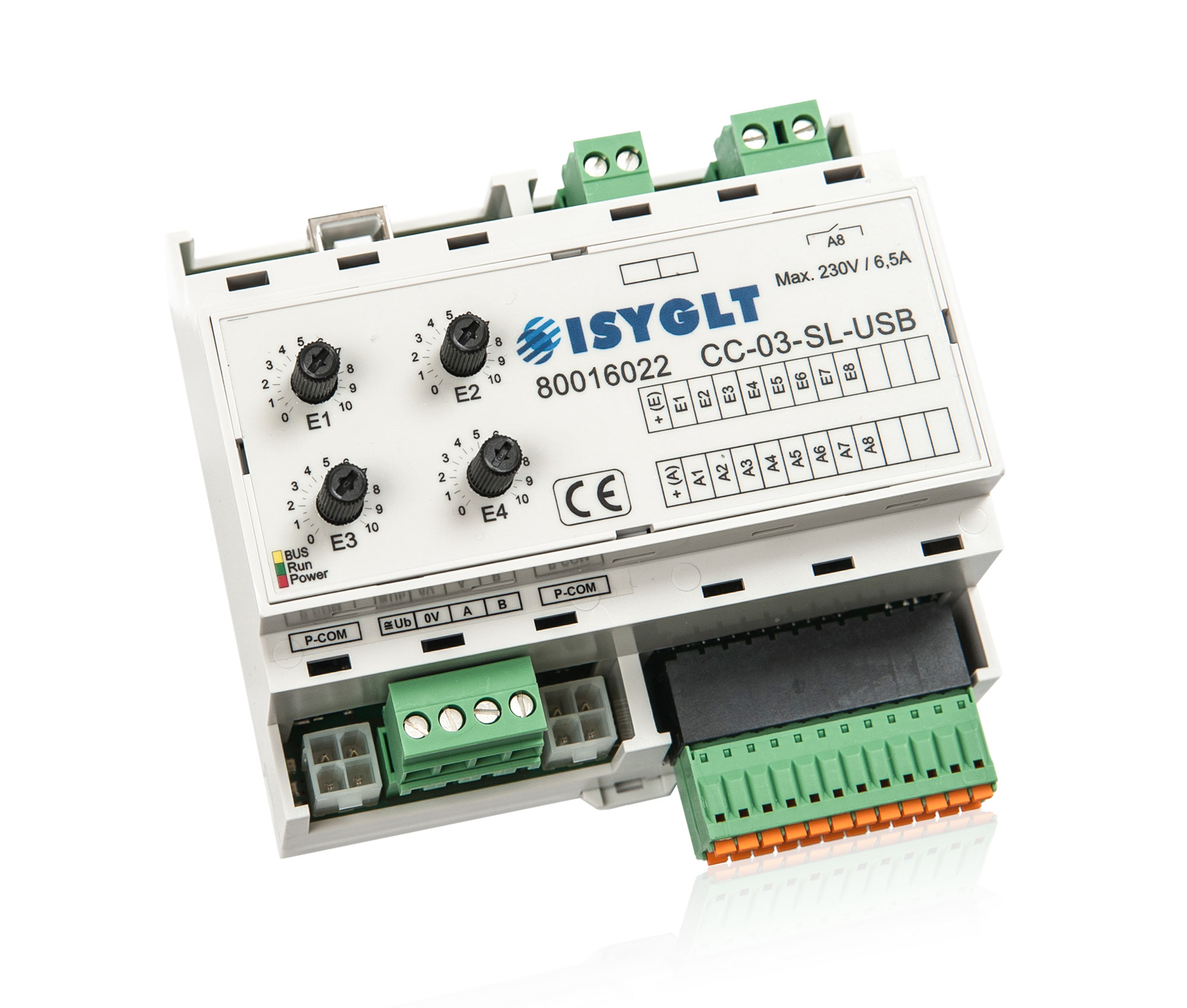 The slim-line CC-03-SL-USB Compact Controller has been developed for implementing small control tasks. The hardware includes a relay output in hybrid technology, 4 potentiometers, 8 low voltage button connections and 8 low voltage feedback signals. With these requirements, a large number of small controls can be implemented. The ISYGLT Controller is freely programmable and can be extended with the available ISYGLT BUS components.