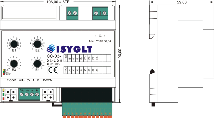 The CC-03-SL-USB Compact Controller slim-line is a freely programmable Master Module of the ISYGLT BUS system. Due to hardware connection options, the controller can be used stand-alone for smaller control tasks. By the extension with the ISYGLT BUS components various control projects can be realised. The DMX and 1-10V interfaces have been omitted in the slim-line version.