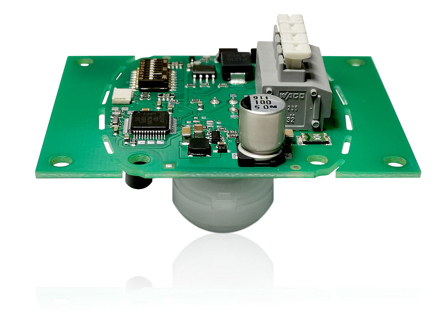 The PIR Motion Sensor is equipped with different detection lenses depending on the type. Up to 4 separately parameterisable sensitivity setups are available for evaluation. Thus, adjustments to customer requirements and local conditions are individually possible, such as activating the lighting only in the case of large movement or maintaining the „ON“ state even in the case of small movement detections.
