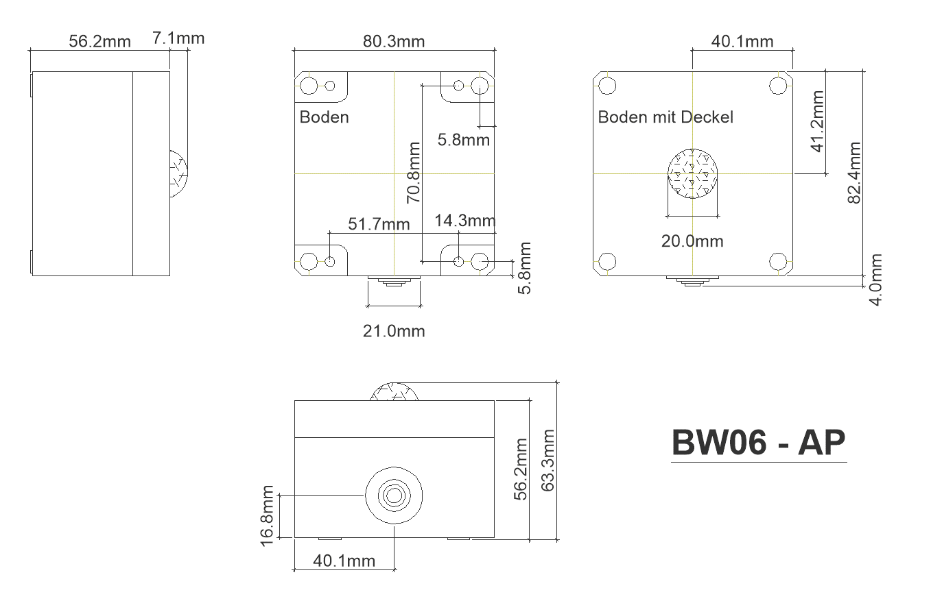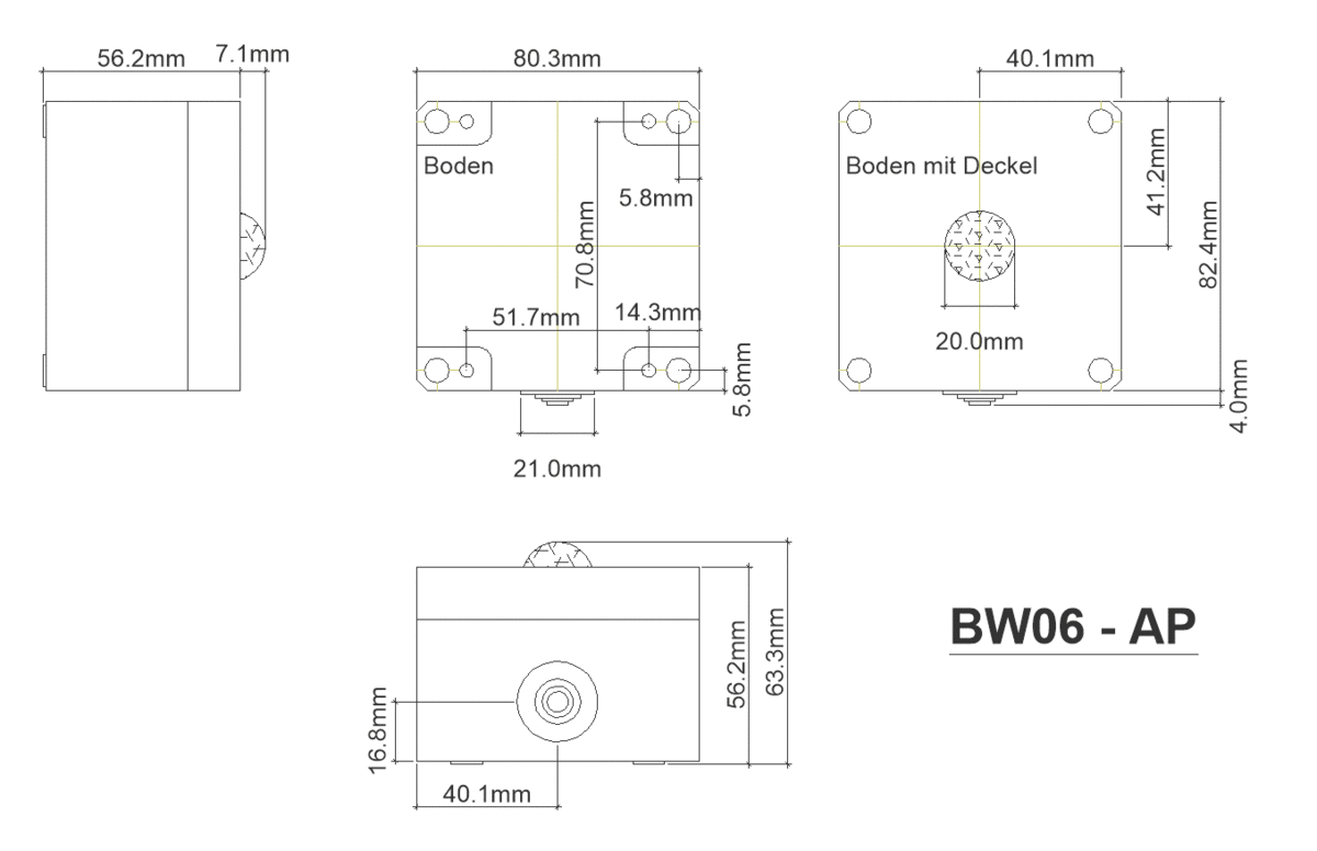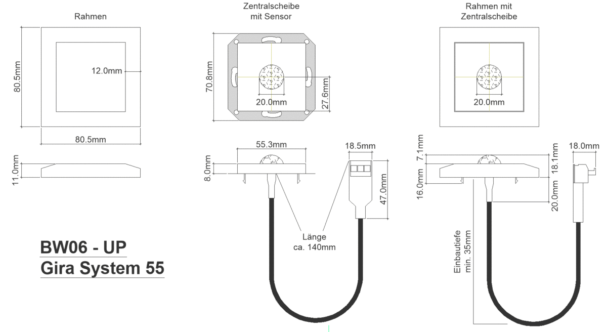 Due to its small size, the Motion Sensor can be easily integrated into devices or lamps. As a delivery variant we also offer a version under the type designation "ISYGLT BW-06-UP" for mounting on commercially available switch boxes. If required, please inquire about the possibilities for corresponding switch ranges from the various manufacturers.