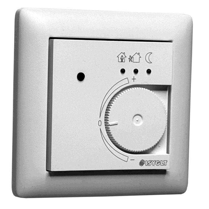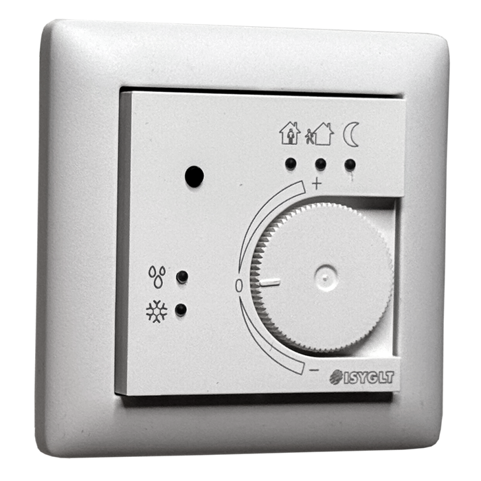 The button controls the change between "Comfort temperature" and "Day or night mode". Each new button press cancels the previous status. This gives the room user the option of choosing between two different setpoint temperatures. The target temperatures can be freely parameterised for both operating modes. If the ISYGLT-BUS system is switched to night mode during the "Day and Comfort" operating mode (comfort temperature), the controller switches to the "Night and Operation" operating mode. If the ISYGLT-BUS system changes back to the "Day" operating mode, the controller remains in the "Operation" operating mode. The button can be locked to prevent tampering. This can be done permanently or only at certain times via the ISYGLT-BUS system. The operating modes can be set from the ISYGLT-BUS system via the BUS and can be confirmed. It is possible to set an operating mode via the ISYGLT-BUS system and then to lock the button in order to prevent manipulation, e.g. in schools etc. It is also possible to switch a room to another operating mode via the ISYGLT-BUS system and then leave the rest of the process to the room user via the button on the controller. The function is freely programmable and can be adapted to individual requirements.
