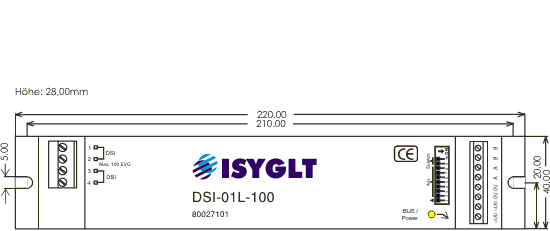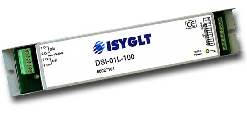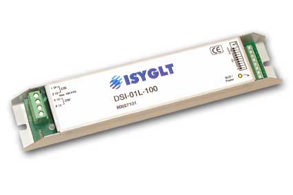 Mit dem Leuchteneinbau-Modul DSI-01L-100 steht ein Modul zur Verfügung, das bezüglich Gehäuse und technischer Daten speziell für den direkten Leuchteneinbau konzipiert wurde. Das Modul hat eine DSI-Schnittstelle, mit der bis zu 100 DSI-ansteuerbare Geräte wie digitale elektronische Vorschaltgeräte für Leuchtstoffröhren und Niedervolt-Transformatoren angesteuert werden können. Die Leuchten (Vorschaltgeräte) bleiben bei dieser Steuerungsart immer an Spannung. Alle Schalt- und Dimmfunktionen sind mit dem DSI-Signal digital realisierbar.