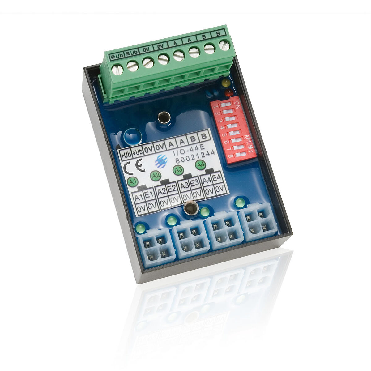 Das Einbau-I/O-Modul dient zur Ankopplung von Leuchtdrucktasten oder Magnetventilen und Tasten an das Subnet. Mit dem Modul können 4 Befehle an das BUS-System übergeben und 4 Meldungen ausgegeben werden. Der Anschluss der Tasten oder Magnetventile erfolgt mittels 4-poligen Molex-Steckerverbindern.