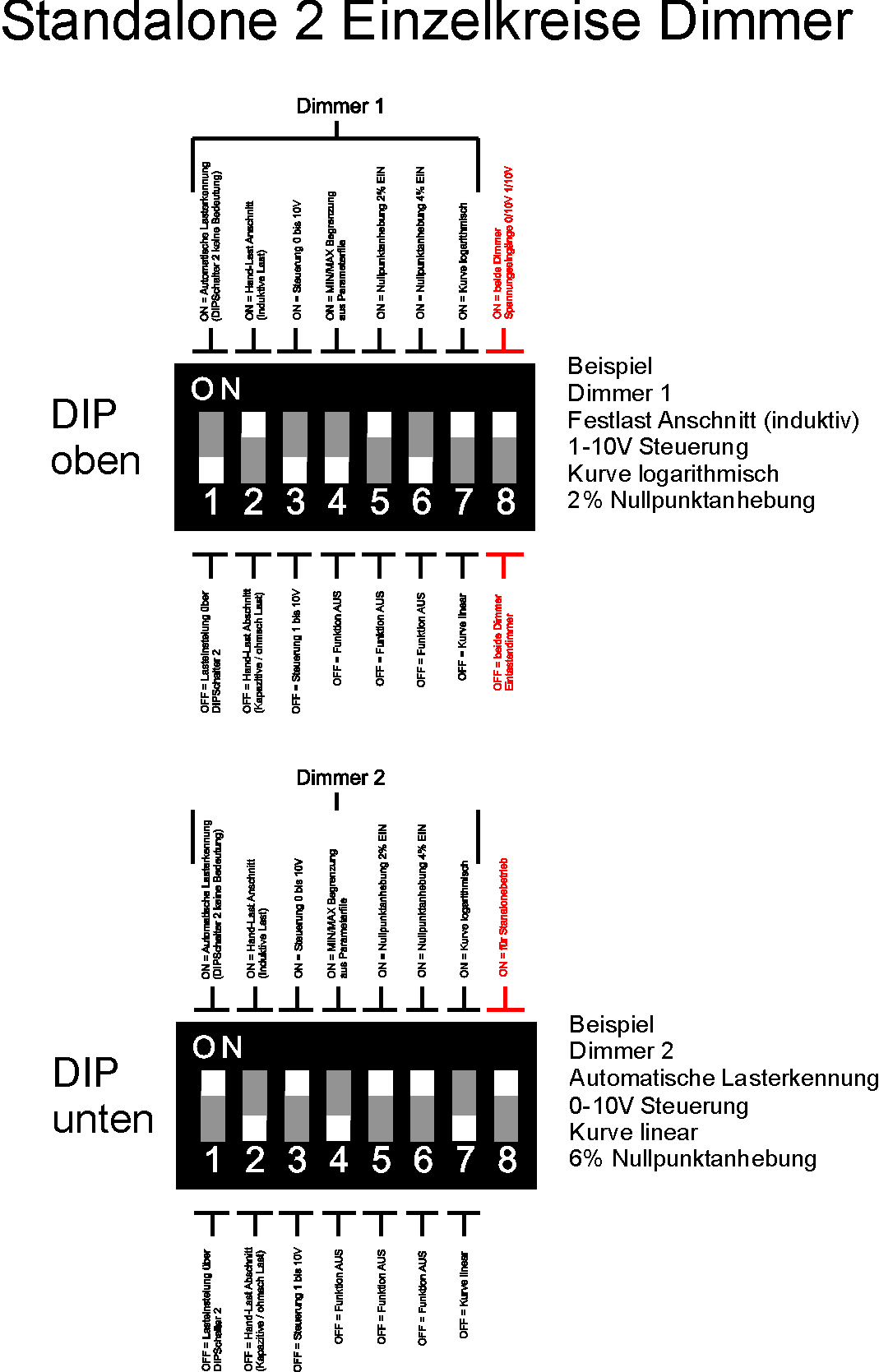 DIP-Schalter Standard-(stand-alone-)Betrieb 2-Kanal-Dimmer (2x500W mit Slave erweiterbar)