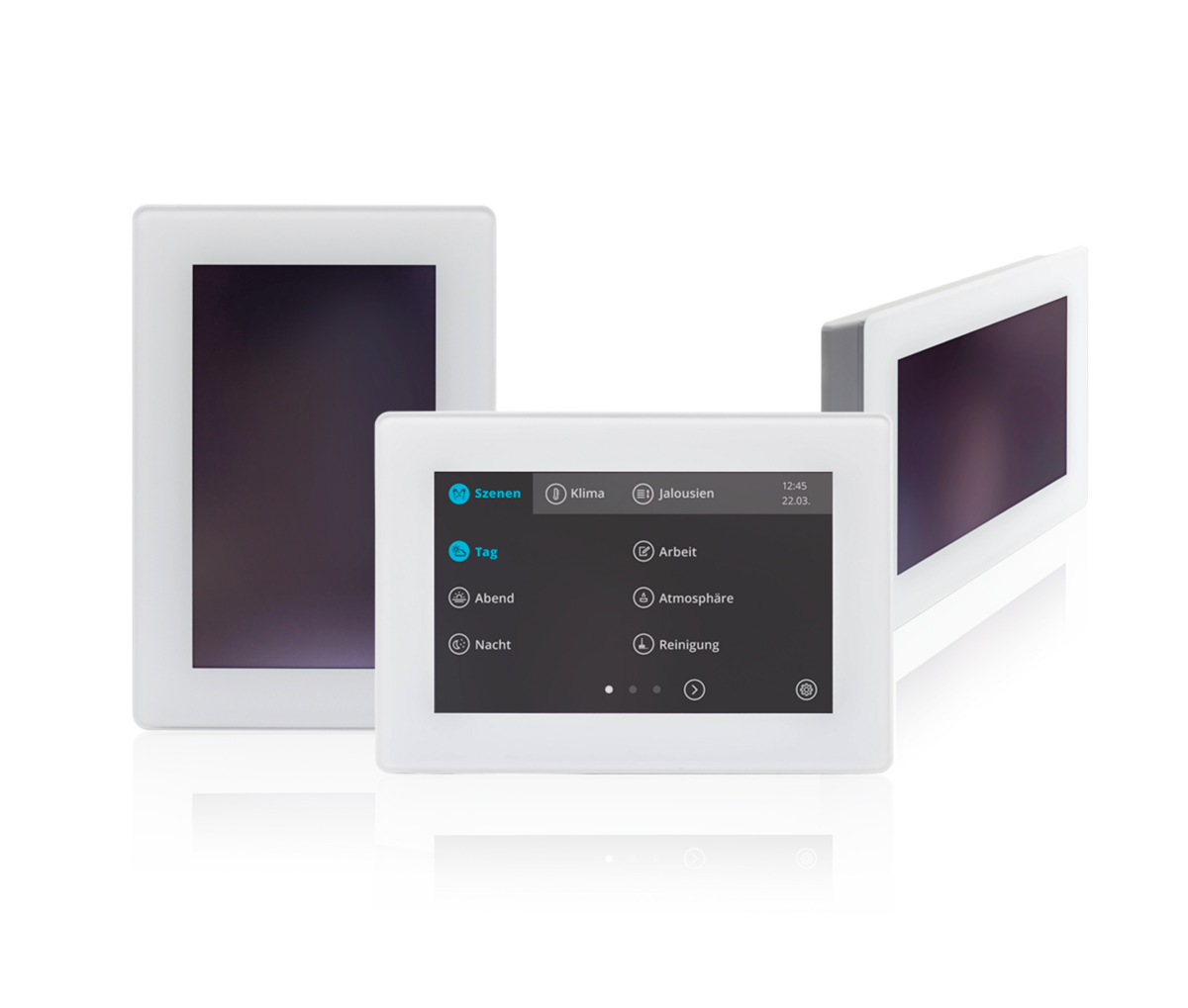 Das Design des WT-G wurde bewusst dezent gehalten, um die architektonische Wirkung des Raumes nicht zu stören. Trotzdem fügt es sich als hochwertiges Glas-Panel in die Umgebung ein und ist auch stimmig mit den meisten Schalterprogrammen. Als Varianten stehen 5" in schwarz und weiß sowie 7" mit schwarzer Glasfront als UP-Variante oder als AP-Variante mit gebürsteten Edelstahl-Design-Abdeckblenden zur Verfügung (weitere Farben und Ausführungen der Blenden auf Anfrage).