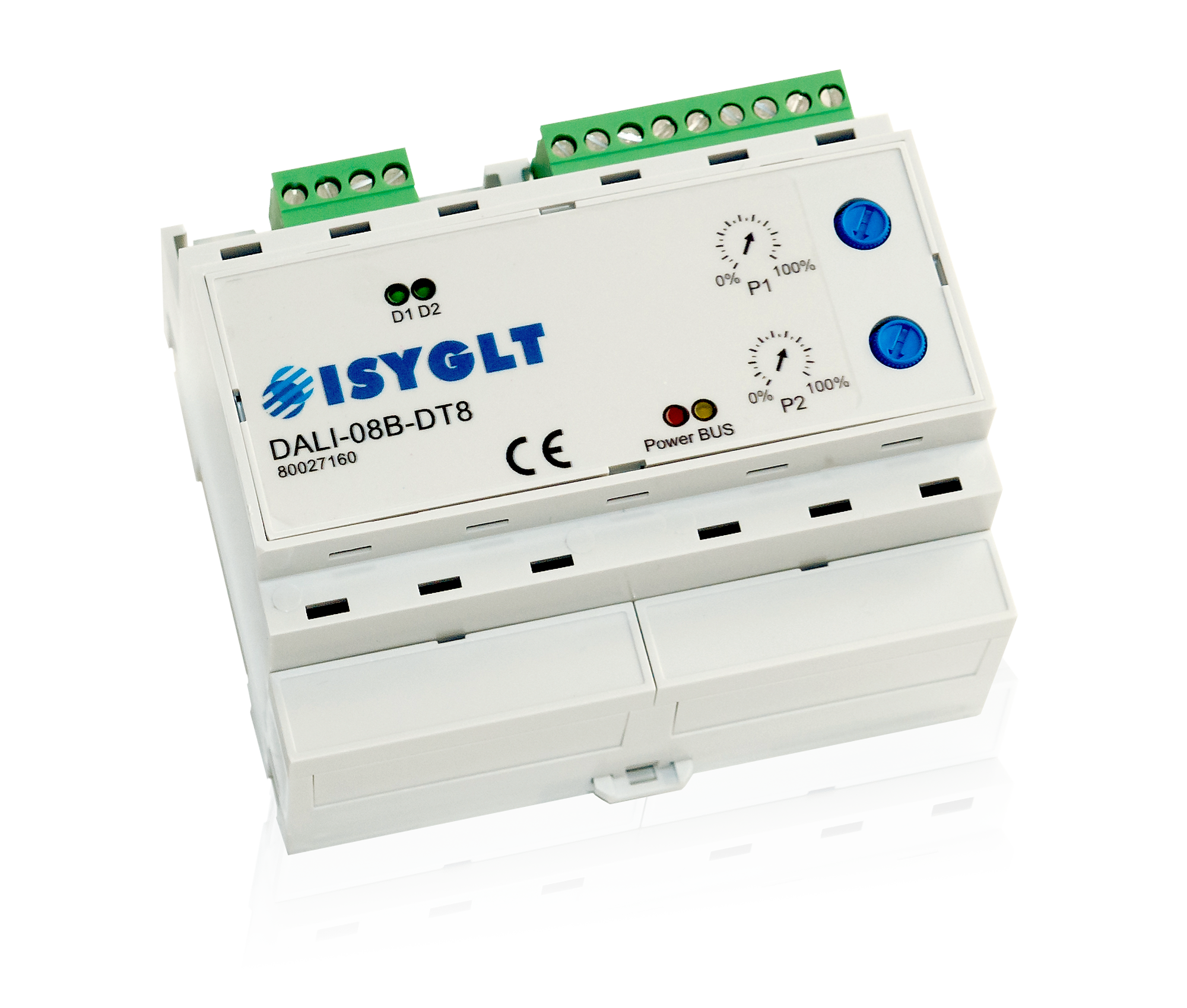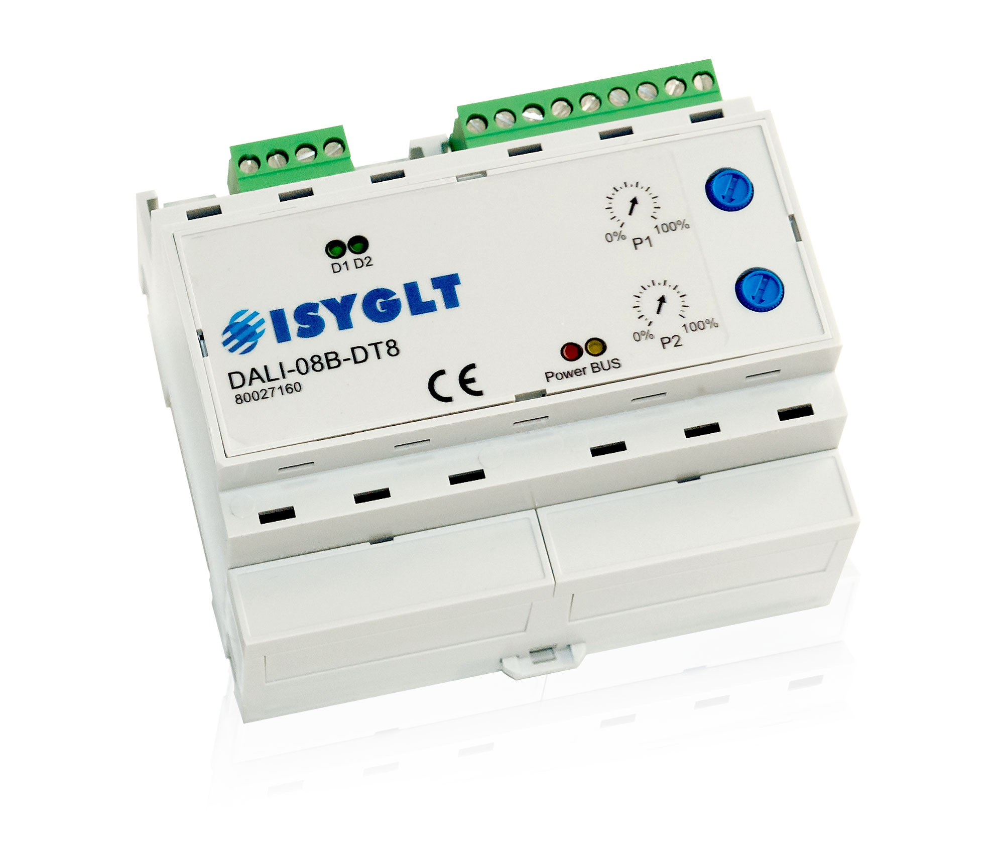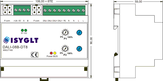 Das DALI-08B-DT8-Modul dient zur Ansteuerung von elektronischen Vorschaltgeräten für Leuchtstofflampen und elektronischen Trafos, die mit dem DALI-Protokoll kommunizieren. An einem DALI-BUS können bis zu 64 elektronische DALI-Vorschaltgeräte (DALI-EVG) betrieben werden. Jeder dieser 64 DALI-Teilnehmer (EVGs oder elektronische Trafos) muss mit einer eindeutigen Geräte-Adresse (DALI-Short-Address) programmiert sein. Jeder Geräte-Adresse kann durch Parametrierung des DALI-08B-DT8-Moduls eine von 8 ISYGLT-Dimm-Gruppen in bis zu 3 Konfigurationen (Setups) zugeordnet werden. Diese Dimmgruppen verfügen über alle im ISYGLT-System möglichen Eigenschaften bezüglich der Szenenspeicherung, Blendzeitberechnungen usw. Des Weiteren kann pro Dimm-Gruppe die Farbinformation gemäß „Device-Type-8-Standard“ gesteuert werden. Der gemischte Betrieb von DT8-Geräten und Standard-DALI-Geräten ist problemlos möglich.