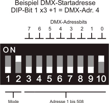 Mit den DIP-Schaltern 3 bis 10 wird die DMX-Adresse festgelegt. Die eingestellte Adresse, multipliziert mit 3 und addiert mit 1, entspricht der ersten von 3 aufeinander folgenden DMX-Adressen.