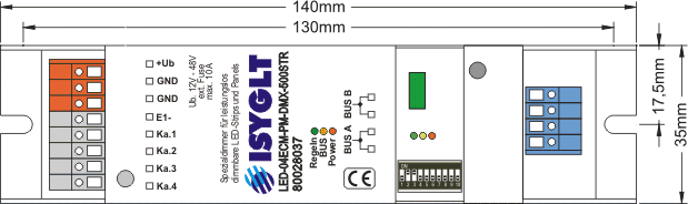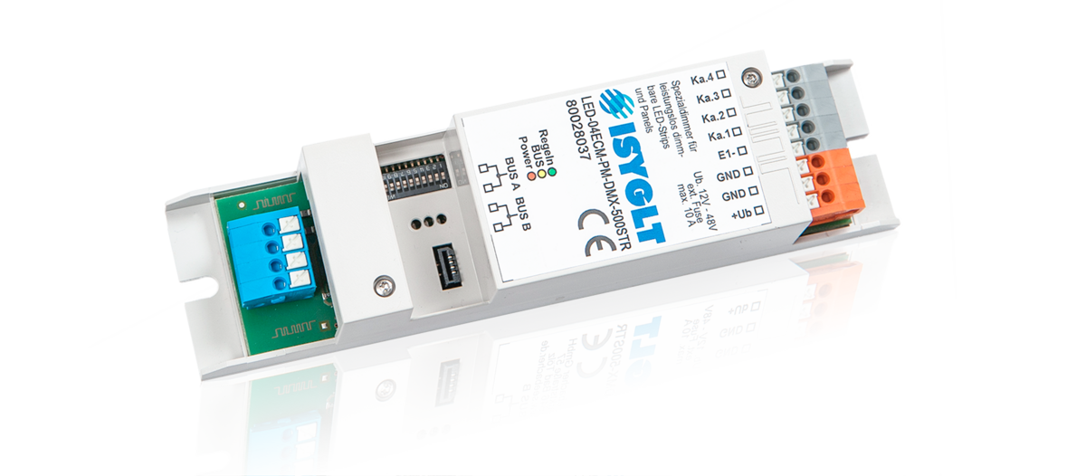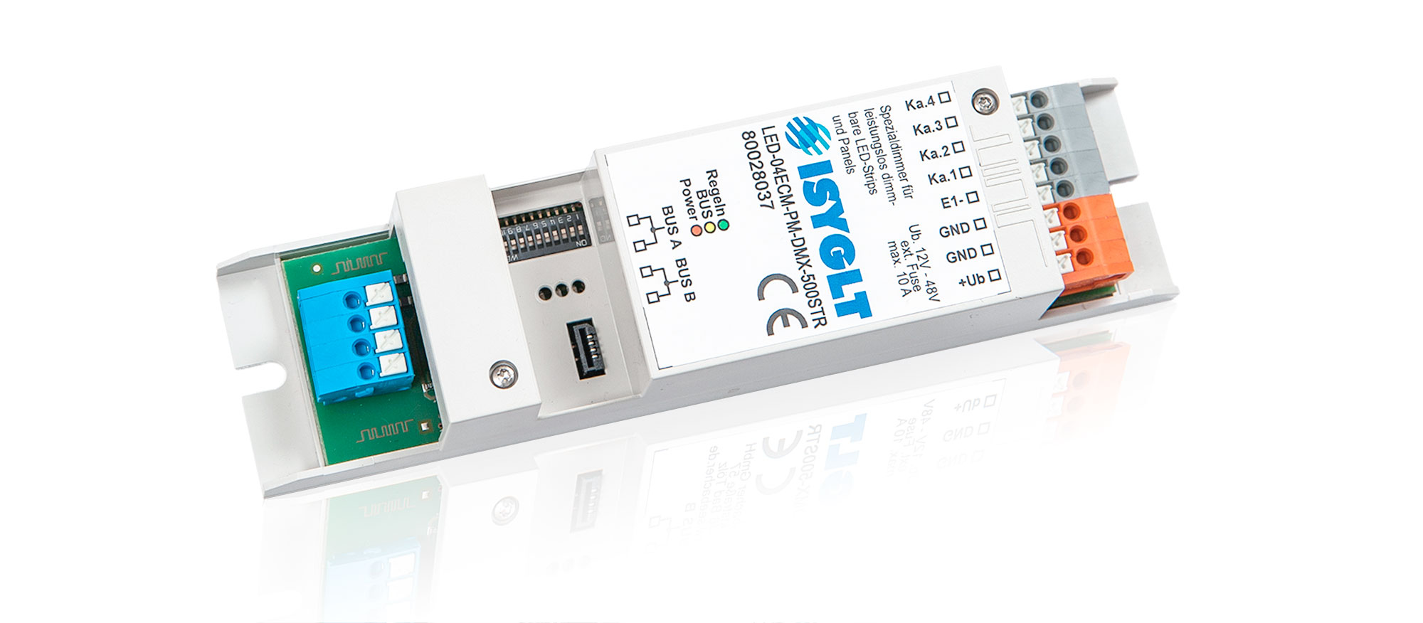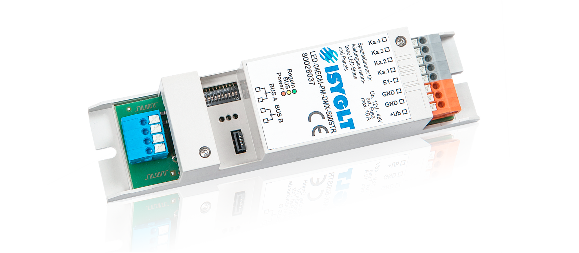Der LED-04ECM-PM-DMX-500STR kann wahlweise am ISYGLT-BUS oder DMX512-BUS betrieben werden.
