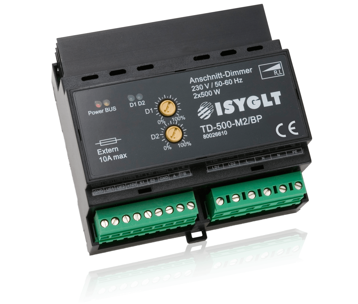 Der TD-Dimmer ist ein klassischer Phasenanschnitt-Dimmer in 16Bit "Thyristor Antiparallel Technologie". Diese Steuerungsart ist mit Sicherheit die Oberklasse der Dimmer und nicht mit den einfacheren Triac-Dimmern zu vergleichen. Hier erfolgt die Ansteuerung und Überwachung für jede Halbwelle getrennt, da entsprechend jeweils ein Thyristor vorhanden und zuständig ist. Der Dimmer zeichnet sich durch seine extreme Robustheit in der jeweiligen Leistungsklasse aus. In der Phasenanschnittsteuerungstechnik können alle ohmschen Lasten (Glühlampen, Hochvolthalogen, Heizungen) und induktiven Verbraucher (Halogen mit magnetischen Trafos, Leuchtstofflampen mit VIP-90, Motore, Kunststoffschweißgeräte mit magnetischen Trafo) betrieben werden. Der Dimmer verfügt über mehrere Ansteuerungsarten und kann konventionell mit Poti, Taste, 0-10V oder 1-10V Signal oder digital im ISYGLT-BUS, DMX512 8-Bit oder DMX512 16-Bit betrieben werden. Die Grundfunktionsparametrierung erfolgt über 2 DIP-Schalter, Detailparameter sind nur im ISYGLT-System einstellbar.