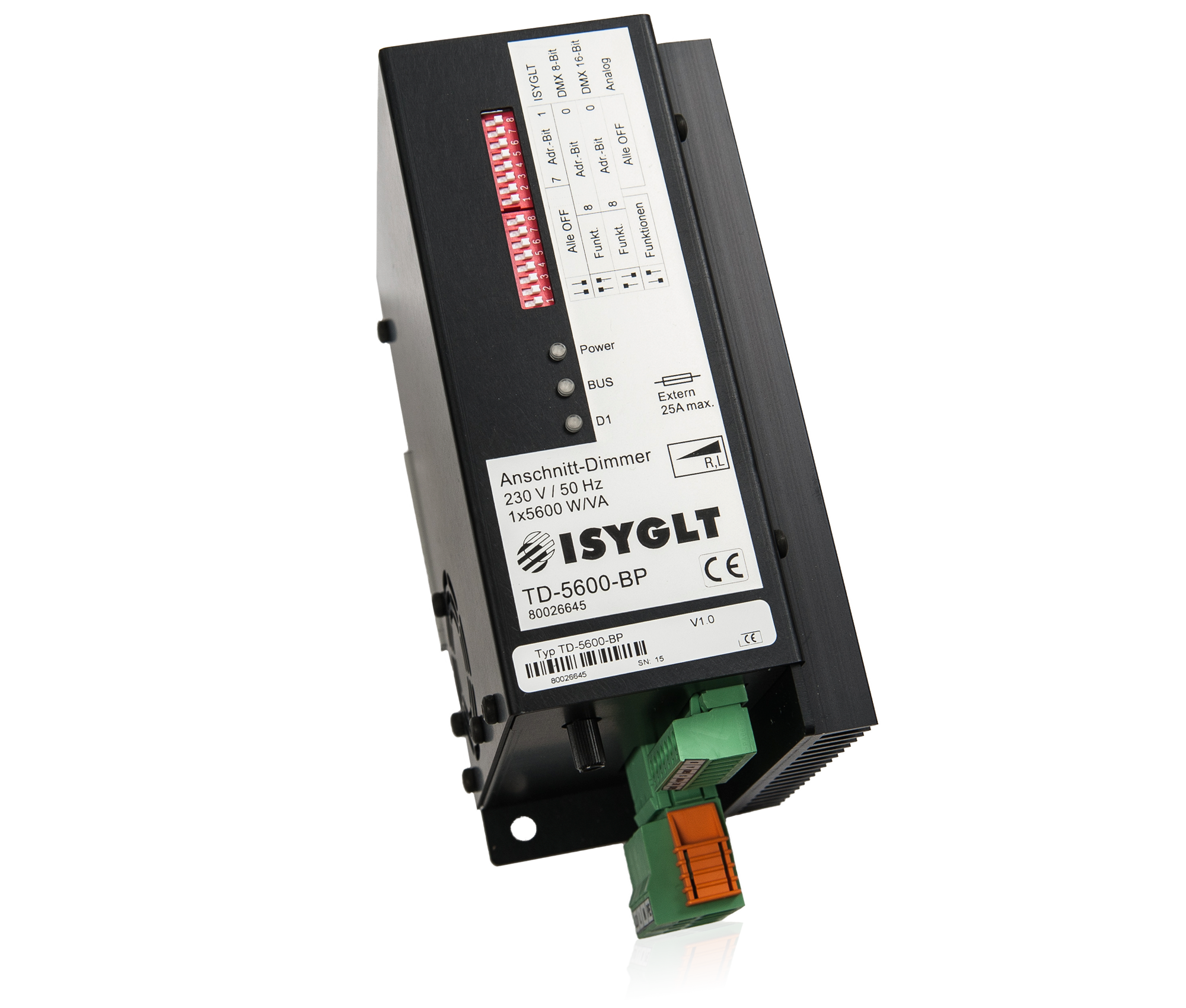 Der TD-Dimmer ist ein klassischer Phasenanschnittdimmer in 16-Bit "Thyristor Antiparallel Technologie". Diese Steuerungsart ist mit Sicherheit die Oberklasse der Dimmer und nicht mit den einfacheren Triac-Dimmern zu vergleichen. Hier erfolgt die Ansteuerung und Überwachung für jede Halbwelle getrennt, da entsprechend jeweils ein Thyristor vorhanden und zuständig ist. Der Dimmer zeichnet sich durch seine extreme Robustheit in der jeweiligen Leistungsklasse aus. In der Phasenanschnittsteuerungstechnik können alle ohmschen Lasten (Glühlampen, Hochvolthalogen, Heizungen) und induktiven Verbraucher (Halogen mit magnetischen Trafos, Leuchtstofflampen mit VIP-90, Motore, Kunststoffschweißgeräte mit magnetischen Trafo) betrieben werden. Der Dimmer verfügt über mehrere Ansteuerungsarten und kann konventionell mit internem oder externem Poti, Taste, 0-10V, 1-10V oder 0-55µA-Signal oder digital im ISYGLT-BUS, DMX512 8-Bit oder DMX512 16-Bit betrieben werden. Die Grundfunktionsparametrierung erfolgt über 2 DIP-Schalter, Detailparameter sind nur im ISYGLT-System einstellbar.