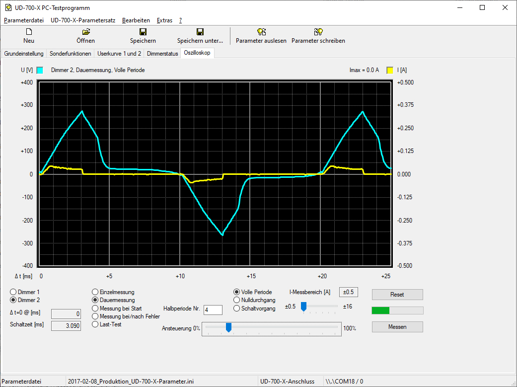 Für ISYGLT-Anwender ist das Parametrieren der Funktionen wie gewohnt im ProgrammDesigner möglich. Für Standalone- bzw. DMX-Anwender steht ein kostenloses Software-Tool zur Verfügung. Hiermit kann per USB- oder RS-485-Datenverbindung der Dimmer per Parameter optimiert und interne Daten wie Temperaturen, Spannungen Spitzenströme und Leistungen angezeigt werden. Zusätzlich ist als Neuheit auch eine Oszilloskop-Funktion integriert. Damit steht erstmals auch dem Anwender ein Hilfsmittel zur Darstellung der aktuellen Last zur Verfügung - und das ohne gefährliche Messungen an der Netzspannung!
