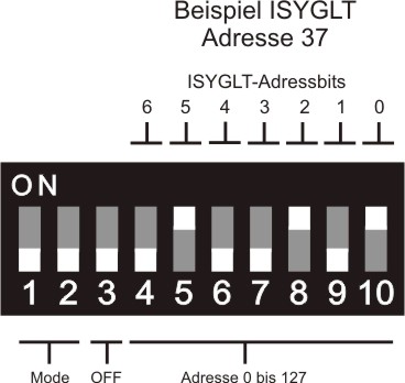 10-poliger DIP-Schalter zur Einstellung der ISYGLT-BUS-Adresse (0-127) befindet sich unter dem Deckel des Moduls.