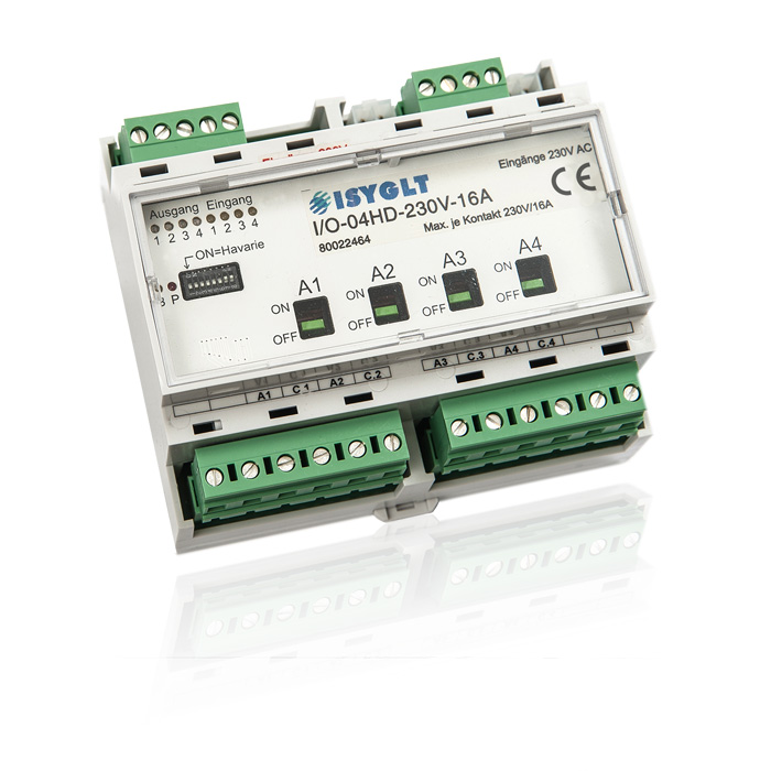 Das I/O-Modul I/O-04HD-230V-16A wurde für Anwendungen konzipiert, bei denen Eingriffe per Hand notwendig sind, bzw. wenn bei BUS- oder Spannungsausfall der Zustand der Relais erhalten bleiben muss.