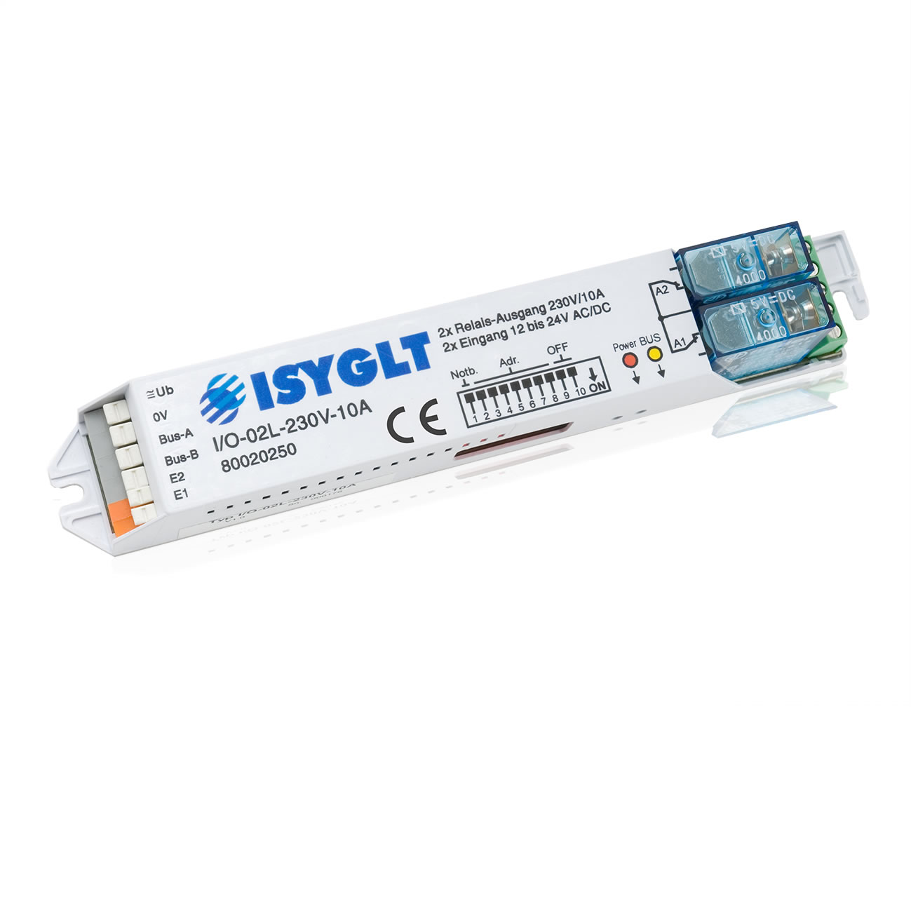 I/O-Modul mit 2 Binär-Eingängen und 2 Relais-Ausgängen für 2 Lichtkreise. Leuchtenendgerät konzipiert speziell für den Leuchteneinbau.
