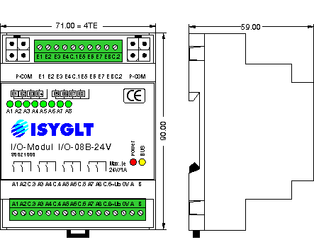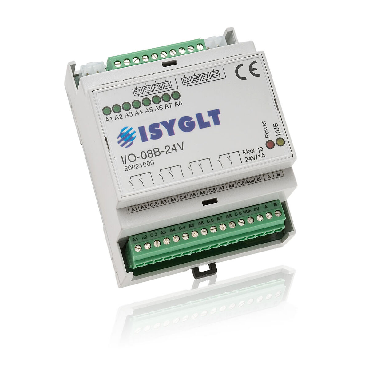 Mit dem I/O-Modul I/O-08B-24V können 8 Stromkreise mit maximal 24V/1A geschaltet werden. Als Eingänge stehen 8 Optokoppler-Eingänge 12-48V (je 4 Eingänge auf einem gemeinsamen Gegenpotential) zur Verfügung. Alle Ein- und Ausgänge sind über die Software in den Funktionen frei programmierbar.