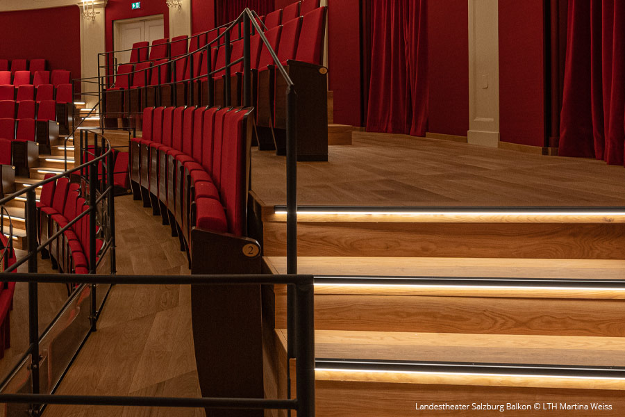 Einen zentralen Bereich der Sanierung stellt die Überarbeitung der knarzenden Balkonpodesterie dar, im Zuge derer auch die Sitzreihen neu ausgerichtet wurden. Die Plätze sind nun über direkt/indirekt beleuchtete Treppen zu erreichen. Die LED-Leisten beleuchten direkt die Trittfläche, wie auch indirekt die vertikale Stufenwand. Standardmäßig ist die Leuchtkraft der Auf- und Abgänge während der Vorstellungen auf ‚leichtes Glimmen‘ (1,5 %) eingestellt, die Stufen bleiben als solche immer klar erkennbar und erfüllen die Notlicht-Kriterien. Die insgesamt 52 Profile werden über unseren LED-04B-ANA-DMX Dimmer gesteuert.
